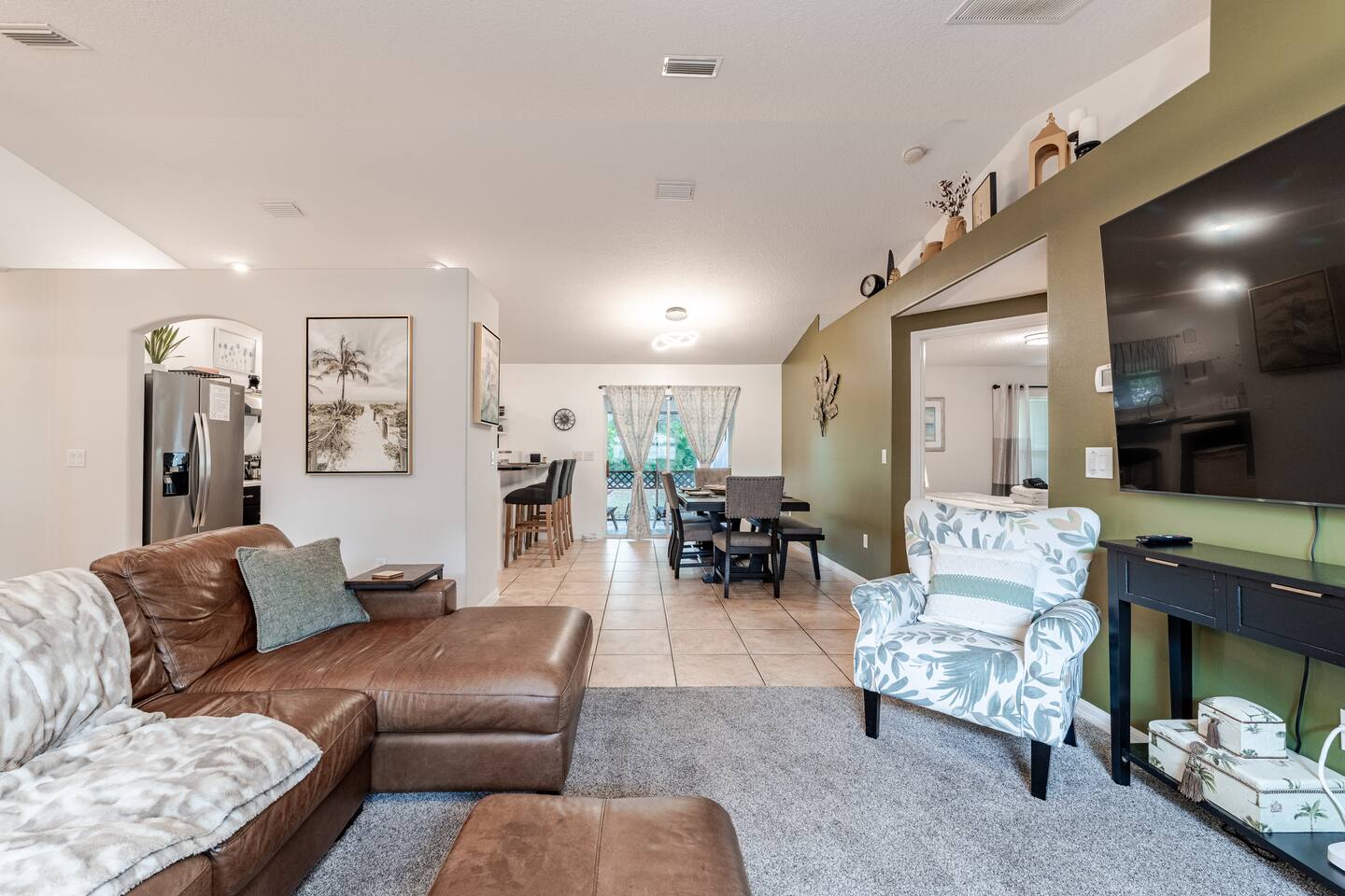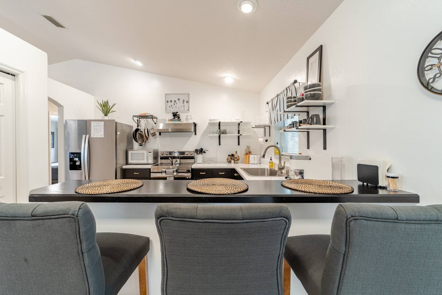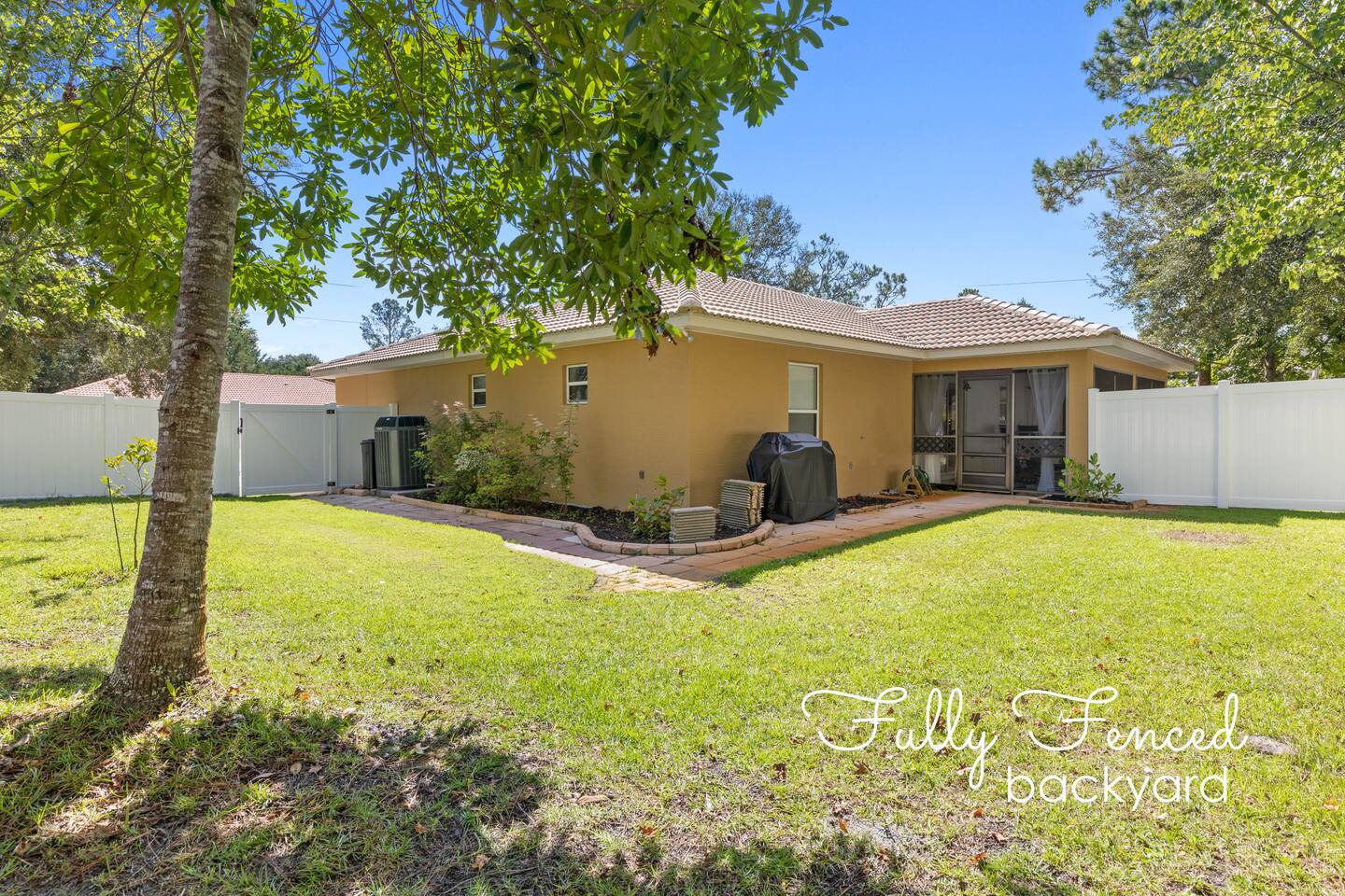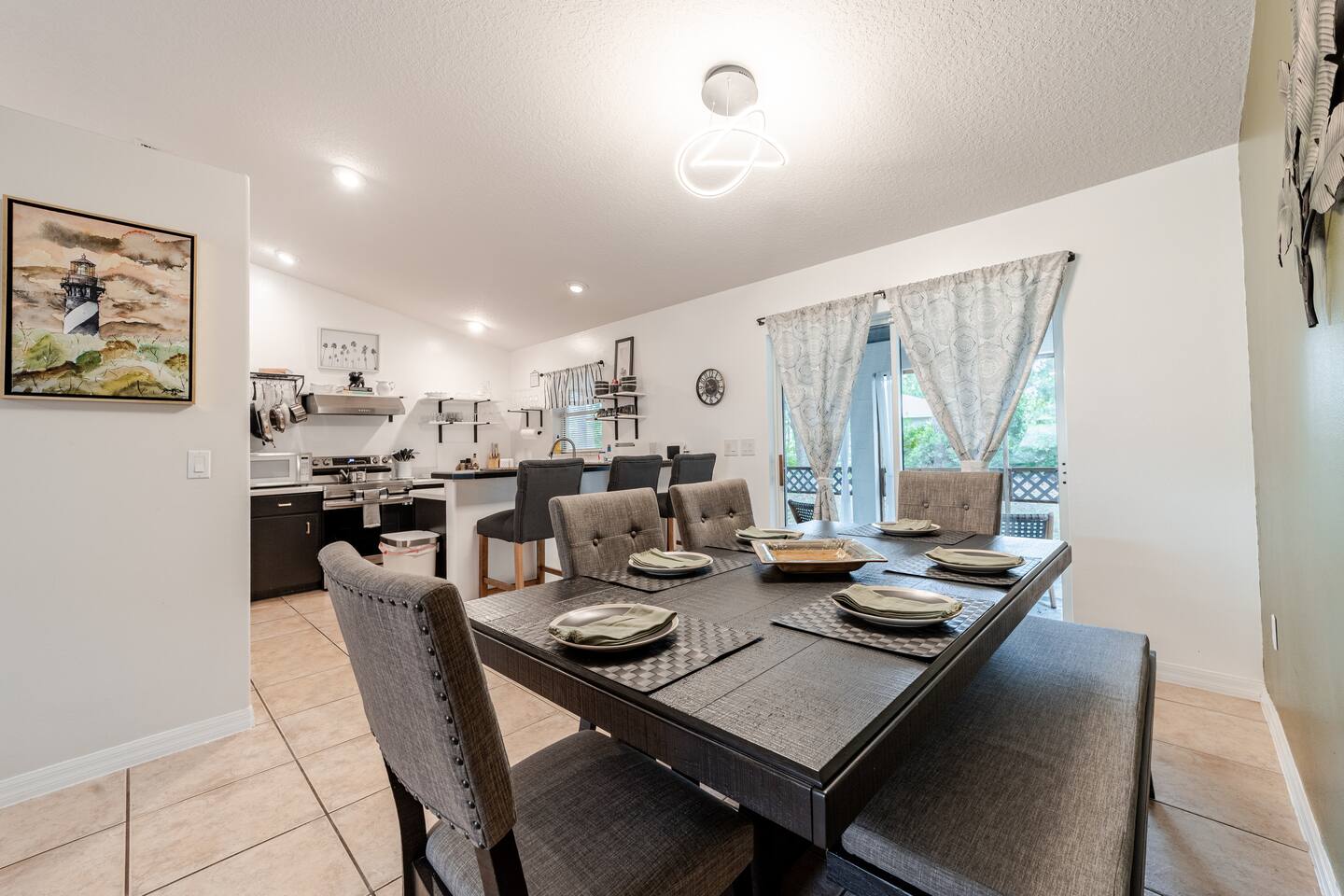 Privacy in the Palms - Palm Coast, Florida <b>KITCHEN</b> The kitchen at "Privacy in the Palms" has been newly updated to enhance your culinary experience. It now boasts open shelving, brand-new appliances including a dishwasher, and a sleek stainless steel stove/oven with a convenient built-in air-fryer. The addition of a deep, double sink and all the essential cooking tools ensures you have everything at hand for whipping up delightful meals. Even our Private Chef has given it his seal of approval! Plus, enjoy serene views of the screened-in lanai and backyard as you cook. <b>LIVING ROOM</b> You'll find an oversized, Italian leather couch with plenty of seating for viewing your favorite show on the new 85 inch flat screen TV with streaming available. There is also a corner desk for those needing to get work or school done during their stay! <b>DINING AREA</b> Gather round the large black wooden table with 4 chairs and a bench with seating for 6 at the table and another 3 stools at the breakfast bar. Great place to enjoy a meal or play games with other couples or the family! <b>PRIMARY (MASTER) BEDROOM</b> You will sink into the beautiful KING size bed and enjoy your own TV with streaming available. The view from the window is into the fenced in doggy yard. You also have your own private bathroom with dual sinks and a walk in shower. You will find a weighted blanket and fidget toys for little ones in the master bedroom closet. <b>SECOND BEDROOM</b> Guests will enjoy the dark gray, gold and white Palm decor AND another KING size bed with views of the front planting beds and butterfly garden. A TV is available for streaming through ROKU. Two couples can easily share this home without anyone fighting over a King size bed. <b>THIRD BEDROOM</b> This bedroom has the QUEEN size bed and is decorated in Aqua blues and grays with a bit more coastal vibe. We can also have a Pack N Play setup in this bedroom for your little ones. The view from the window is into the backyard. <b>SCREENED IN LANAI</b> With a view of the lush greenspace to the rear, you will enjoy sitting and listening to the various frogs and bugs and birds. You also might catch a glimpse of the momma and baby deer that occasionally wonder through the yard. Doors on each end open either to the large, fenced-in doggy yard or the back and side yards where you are welcome to wonder the property and check out all the landscaping including the butterfly garden on the side. You will see a few items around that you would not normally see in a rental! We strive to make this vacation rental safe & comfortable for families with children on the Autism Spectrum by added extra locks, alarms on doors and windows, emergency exit lights, night lights, furniture anchors, kid-friendly furniture, weighted blanket and fidget toys and more! If you have a family member on the autism spectrum, you will rest easy knowing they can easily be kept safe while on vacation! **Need more room? We have other rentals in the area that we help host. Just ask if you need more room!