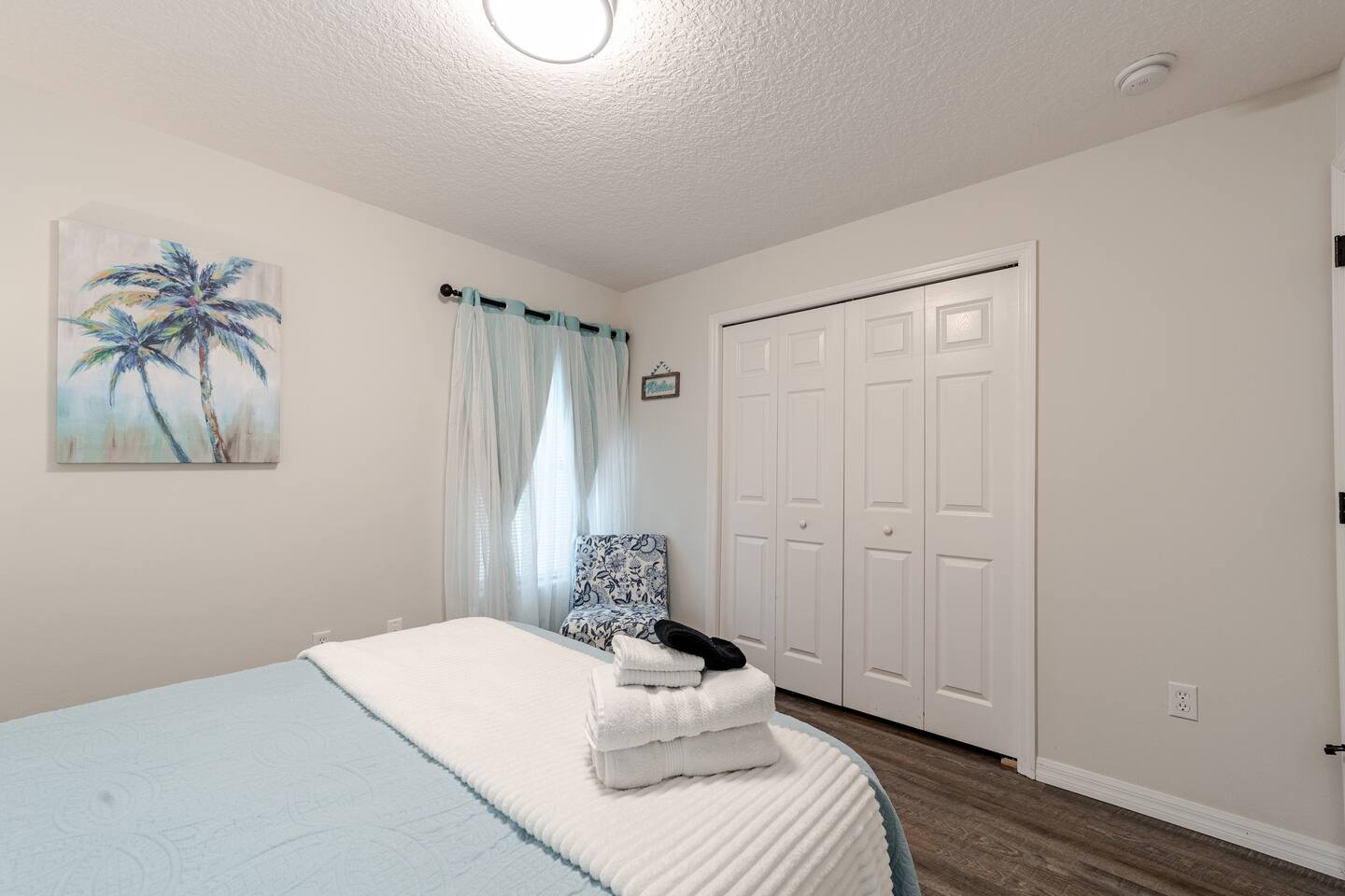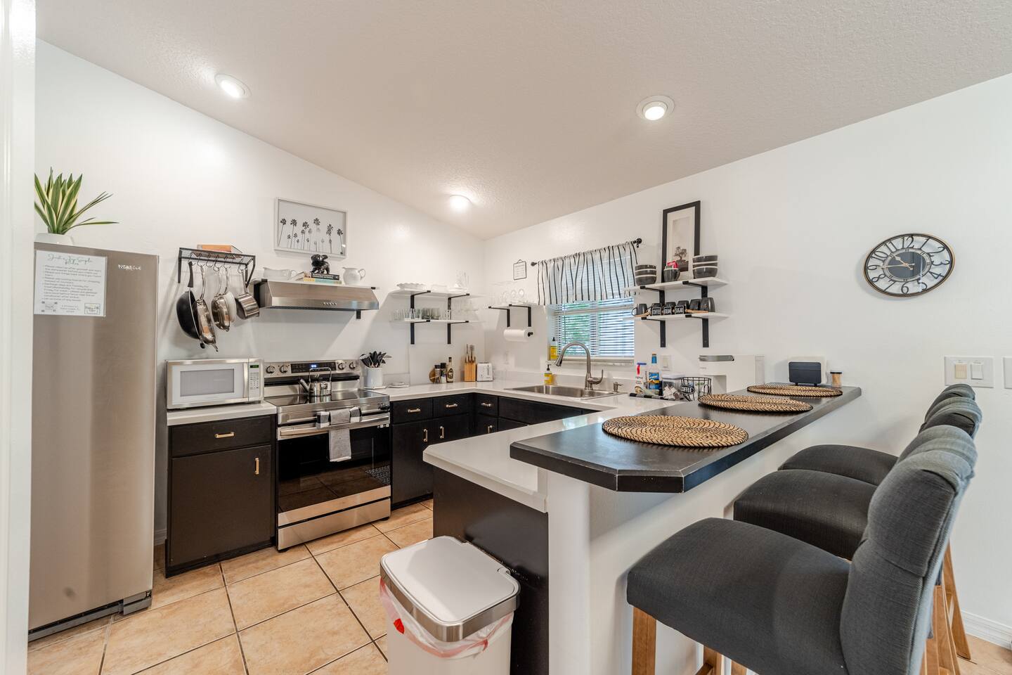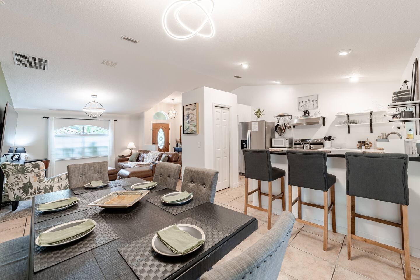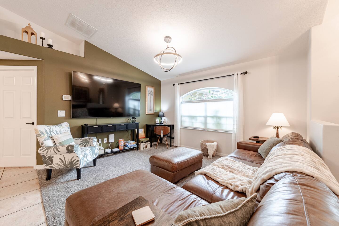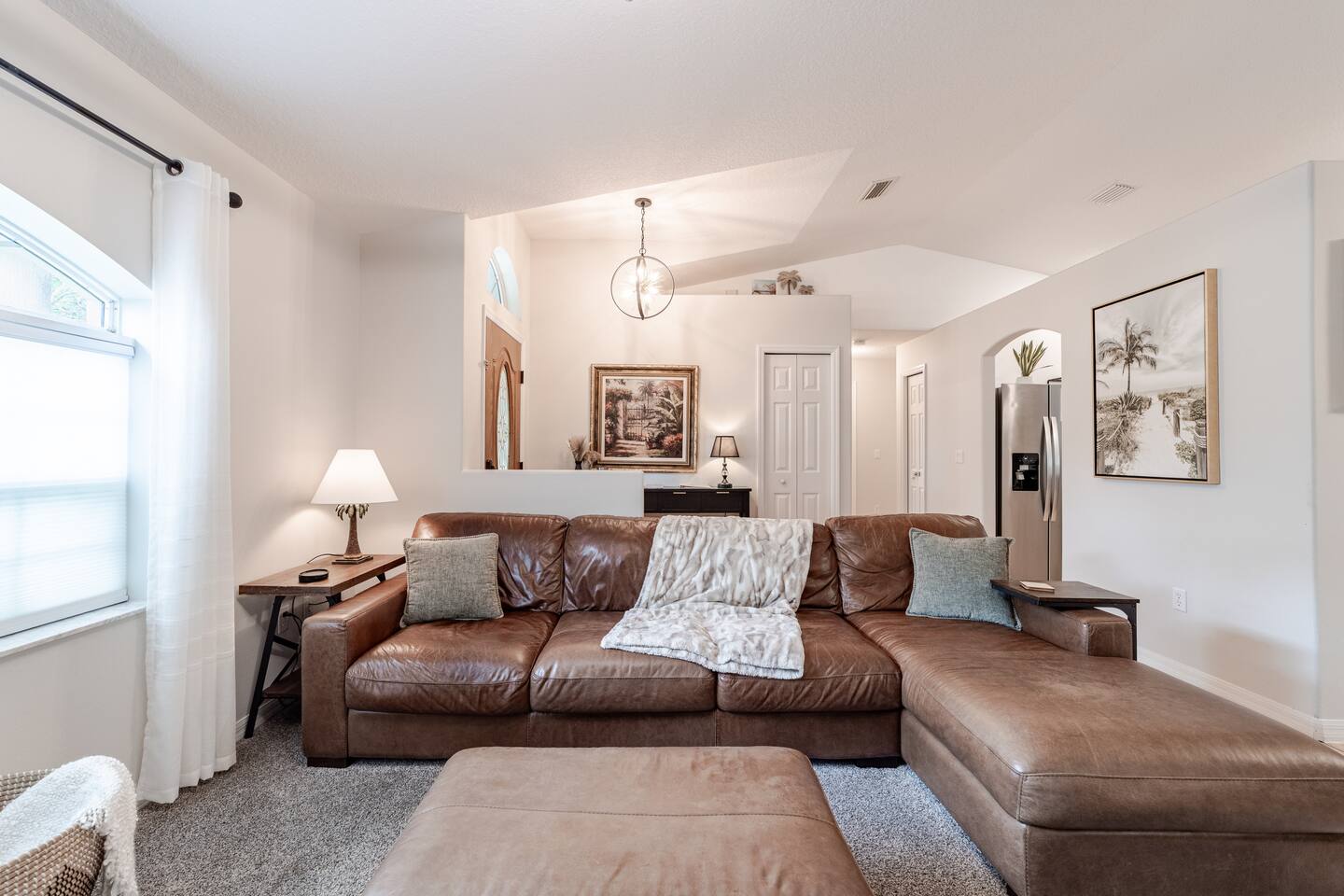 Privacy in the Palms - Palm Coast, Florida <b>KITCHEN</b> The kitchen at "Privacy in the Palms" has been newly updated to enhance your culinary experience. It now boasts open shelving, brand-new appliances including a dishwasher, and a sleek stainless steel stove/oven with a convenient built-in air-fryer. The addition of a deep, double sink and all the essential cooking tools ensures you have everything at hand for whipping up delightful meals. Even our Private Chef has given it his seal of approval! Plus, enjoy serene views of the screened-in lanai and backyard as you cook. <b>LIVING ROOM</b> You'll find an oversized, Italian leather couch with plenty of seating for viewing your favorite show on the new 85 inch flat screen TV with streaming available. There is also a corner desk for those needing to get work or school done during their stay! <b>DINING AREA</b> Gather round the large black wooden table with 4 chairs and a bench with seating for 6 at the table and another 3 stools at the breakfast bar. Great place to enjoy a meal or play games with other couples or the family! <b>PRIMARY (MASTER) BEDROOM</b> You will sink into the beautiful KING size bed and enjoy your own TV with streaming available. The view from the window is into the fenced in doggy yard. You also have your own private bathroom with dual sinks and a walk in shower. You will find a weighted blanket and fidget toys for little ones in the master bedroom closet. <b>SECOND BEDROOM</b> Guests will enjoy the dark gray, gold and white Palm decor AND another KING size bed with views of the front planting beds and butterfly garden. A TV is available for streaming through ROKU. Two couples can easily share this home without anyone fighting over a King size bed. <b>THIRD BEDROOM</b> This bedroom has the QUEEN size bed and is decorated in Aqua blues and grays with a bit more coastal vibe. We can also have a Pack N Play setup in this bedroom for your little ones. The view from the window is into the backyard. <b>SCREENED IN LANAI</b> With a view of the lush greenspace to the rear, you will enjoy sitting and listening to the various frogs and bugs and birds. You also might catch a glimpse of the momma and baby deer that occasionally wonder through the yard. Doors on each end open either to the large, fenced-in doggy yard or the back and side yards where you are welcome to wonder the property and check out all the landscaping including the butterfly garden on the side. You will see a few items around that you would not normally see in a rental! We strive to make this vacation rental safe & comfortable for families with children on the Autism Spectrum by added extra locks, alarms on doors and windows, emergency exit lights, night lights, furniture anchors, kid-friendly furniture, weighted blanket and fidget toys and more! If you have a family member on the autism spectrum, you will rest easy knowing they can easily be kept safe while on vacation! **Need more room? We have other rentals in the area that we help host. Just ask if you need more room!