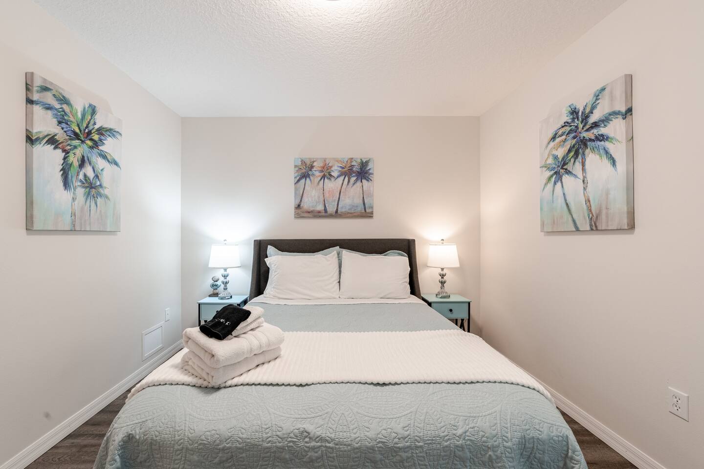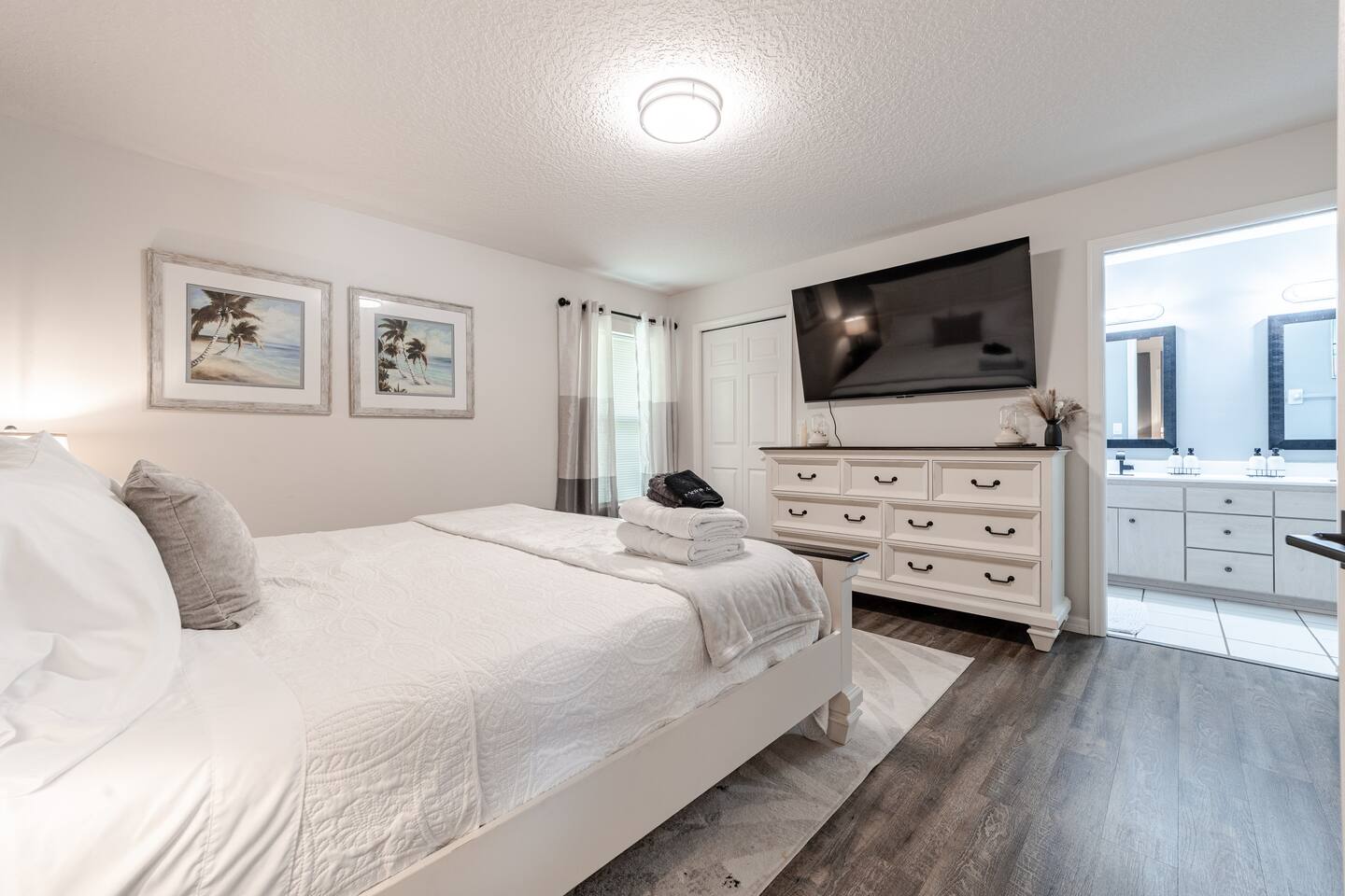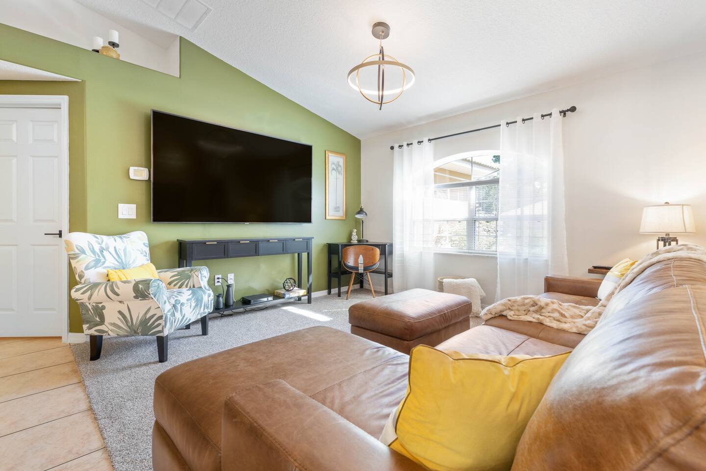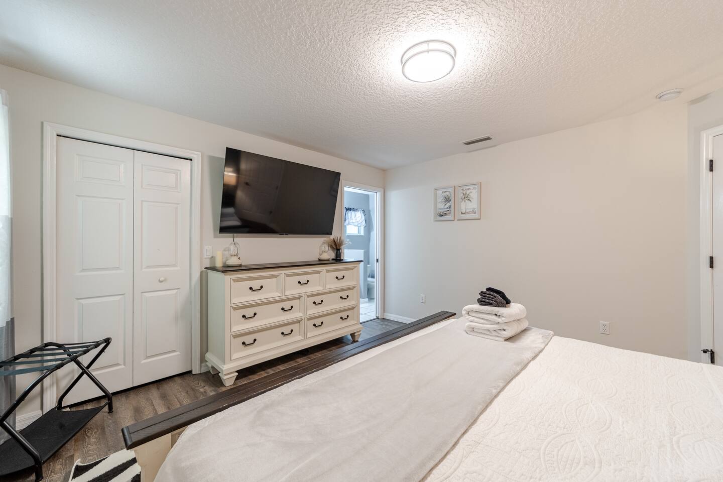 Privacy in the Palms - Palm Coast, Florida <b>KITCHEN</b> The kitchen at "Privacy in the Palms" has been newly updated to enhance your culinary experience. It now boasts open shelving, brand-new appliances including a dishwasher, and a sleek stainless steel stove/oven with a convenient built-in air-fryer. The addition of a deep, double sink and all the essential cooking tools ensures you have everything at hand for whipping up delightful meals. Even our Private Chef has given it his seal of approval! Plus, enjoy serene views of the screened-in lanai and backyard as you cook. <b>LIVING ROOM</b> You'll find an oversized, Italian leather couch with plenty of seating for viewing your favorite show on the new 85 inch flat screen TV with streaming available. There is also a corner desk for those needing to get work or school done during their stay! <b>DINING AREA</b> Gather round the large black wooden table with 4 chairs and a bench with seating for 6 at the table and another 3 stools at the breakfast bar. Great place to enjoy a meal or play games with other couples or the family! <b>PRIMARY (MASTER) BEDROOM</b> You will sink into the beautiful KING size bed and enjoy your own TV with streaming available. The view from the window is into the fenced in doggy yard. You also have your own private bathroom with dual sinks and a walk in shower. You will find a weighted blanket and fidget toys for little ones in the master bedroom closet. <b>SECOND BEDROOM</b> Guests will enjoy the dark gray, gold and white Palm decor AND another KING size bed with views of the front planting beds and butterfly garden. A TV is available for streaming through ROKU. Two couples can easily share this home without anyone fighting over a King size bed. <b>THIRD BEDROOM</b> This bedroom has the QUEEN size bed and is decorated in Aqua blues and grays with a bit more coastal vibe. We can also have a Pack N Play setup in this bedroom for your little ones. The view from the window is into the backyard. <b>SCREENED IN LANAI</b> With a view of the lush greenspace to the rear, you will enjoy sitting and listening to the various frogs and bugs and birds. You also might catch a glimpse of the momma and baby deer that occasionally wonder through the yard. Doors on each end open either to the large, fenced-in doggy yard or the back and side yards where you are welcome to wonder the property and check out all the landscaping including the butterfly garden on the side. You will see a few items around that you would not normally see in a rental! We strive to make this vacation rental safe & comfortable for families with children on the Autism Spectrum by added extra locks, alarms on doors and windows, emergency exit lights, night lights, furniture anchors, kid-friendly furniture, weighted blanket and fidget toys and more! If you have a family member on the autism spectrum, you will rest easy knowing they can easily be kept safe while on vacation! **Need more room? We have other rentals in the area that we help host. Just ask if you need more room!