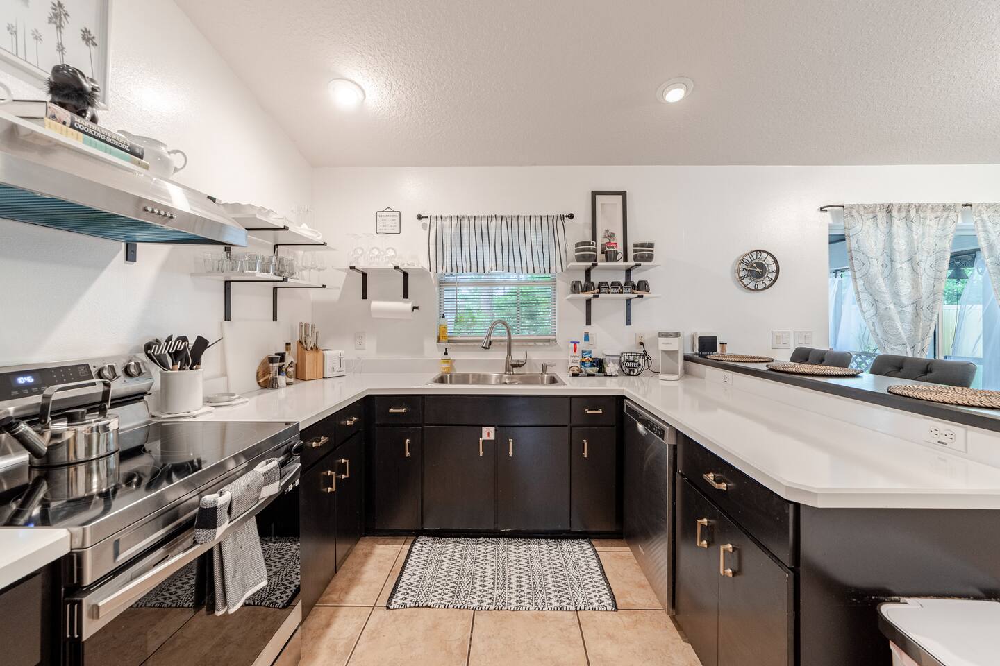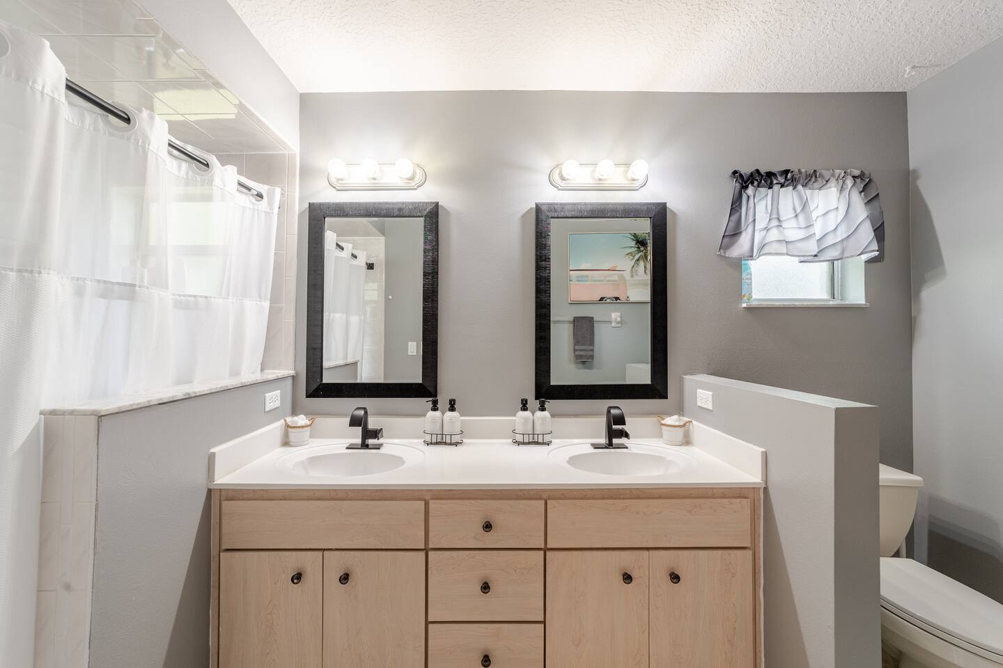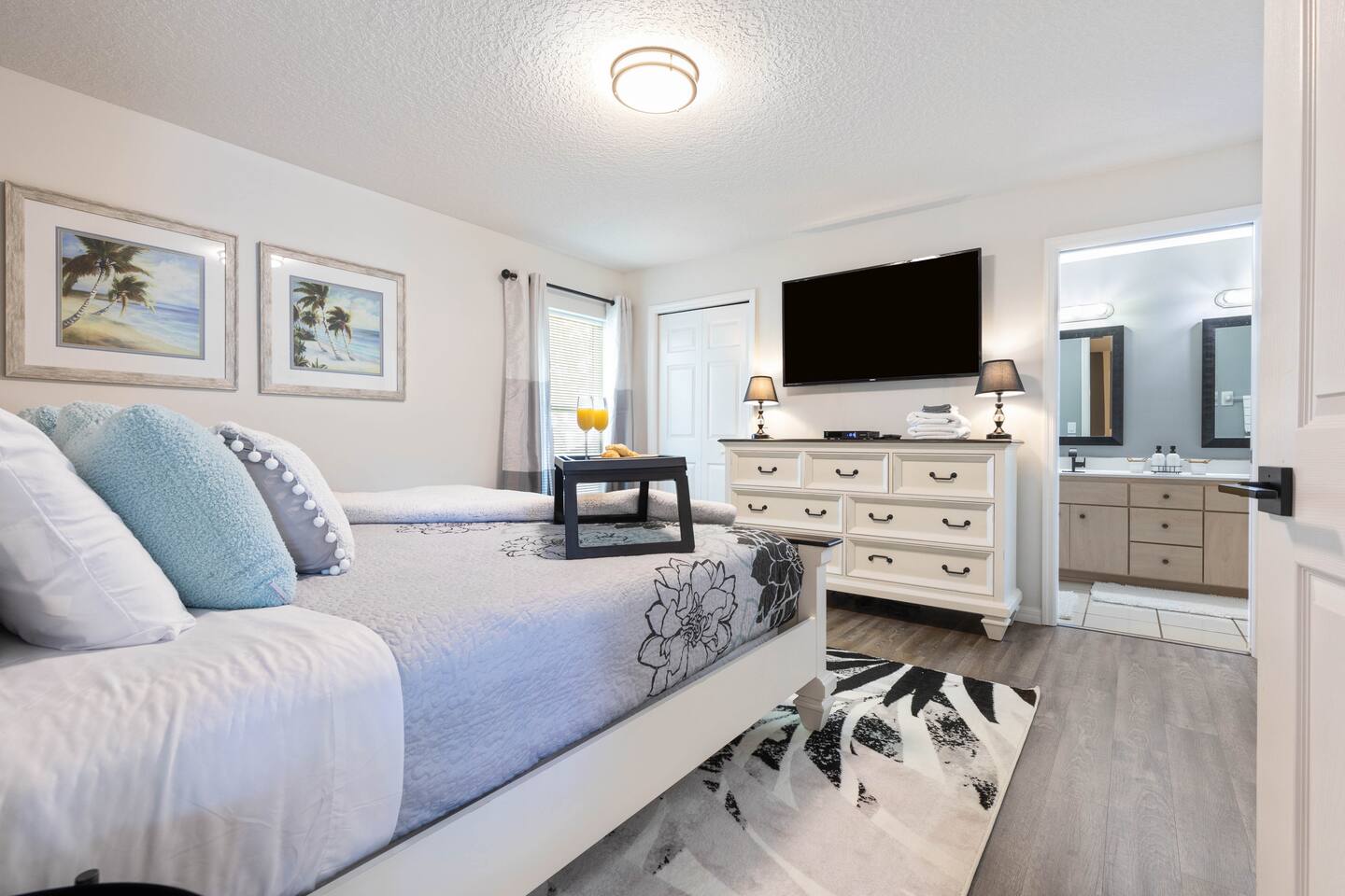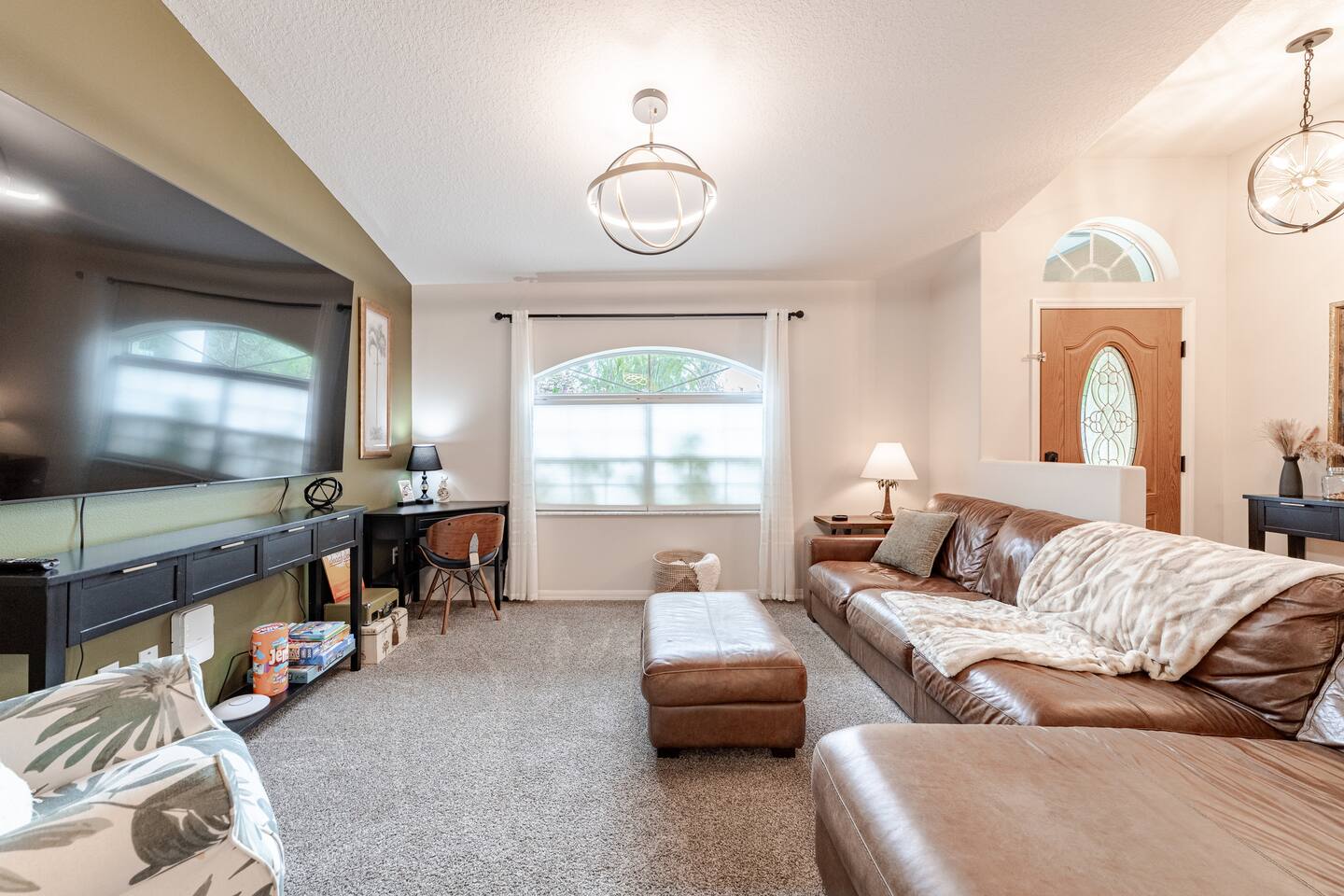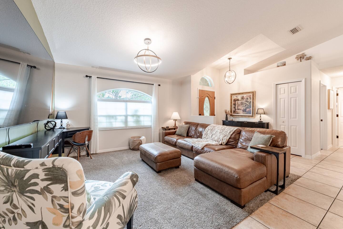 Privacy in the Palms - Palm Coast, Florida <b>KITCHEN</b> The kitchen at "Privacy in the Palms" has been newly updated to enhance your culinary experience. It now boasts open shelving, brand-new appliances including a dishwasher, and a sleek stainless steel stove/oven with a convenient built-in air-fryer. The addition of a deep, double sink and all the essential cooking tools ensures you have everything at hand for whipping up delightful meals. Even our Private Chef has given it his seal of approval! Plus, enjoy serene views of the screened-in lanai and backyard as you cook. <b>LIVING ROOM</b> You'll find an oversized, Italian leather couch with plenty of seating for viewing your favorite show on the new 85 inch flat screen TV with streaming available. There is also a corner desk for those needing to get work or school done during their stay! <b>DINING AREA</b> Gather round the large black wooden table with 4 chairs and a bench with seating for 6 at the table and another 3 stools at the breakfast bar. Great place to enjoy a meal or play games with other couples or the family! <b>PRIMARY (MASTER) BEDROOM</b> You will sink into the beautiful KING size bed and enjoy your own TV with streaming available. The view from the window is into the fenced in doggy yard. You also have your own private bathroom with dual sinks and a walk in shower. You will find a weighted blanket and fidget toys for little ones in the master bedroom closet. <b>SECOND BEDROOM</b> Guests will enjoy the dark gray, gold and white Palm decor AND another KING size bed with views of the front planting beds and butterfly garden. A TV is available for streaming through ROKU. Two couples can easily share this home without anyone fighting over a King size bed. <b>THIRD BEDROOM</b> This bedroom has the QUEEN size bed and is decorated in Aqua blues and grays with a bit more coastal vibe. We can also have a Pack N Play setup in this bedroom for your little ones. The view from the window is into the backyard. <b>SCREENED IN LANAI</b> With a view of the lush greenspace to the rear, you will enjoy sitting and listening to the various frogs and bugs and birds. You also might catch a glimpse of the momma and baby deer that occasionally wonder through the yard. Doors on each end open either to the large, fenced-in doggy yard or the back and side yards where you are welcome to wonder the property and check out all the landscaping including the butterfly garden on the side. You will see a few items around that you would not normally see in a rental! We strive to make this vacation rental safe & comfortable for families with children on the Autism Spectrum by added extra locks, alarms on doors and windows, emergency exit lights, night lights, furniture anchors, kid-friendly furniture, weighted blanket and fidget toys and more! If you have a family member on the autism spectrum, you will rest easy knowing they can easily be kept safe while on vacation! **Need more room? We have other rentals in the area that we help host. Just ask if you need more room!